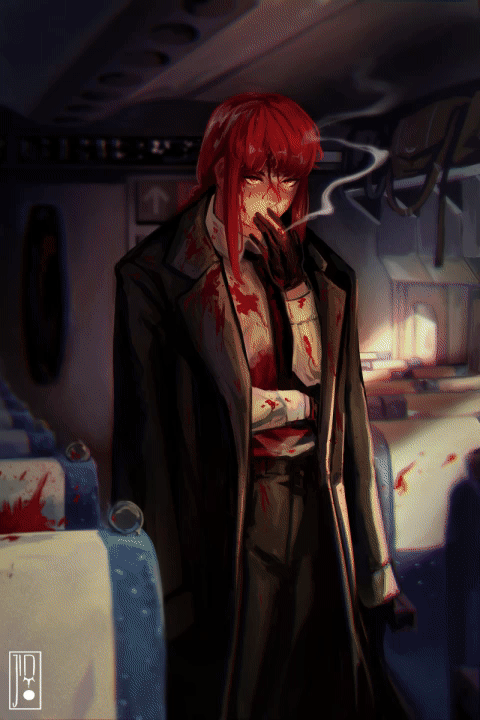 Fanart of the Makima train scene in Chainsaw Man, but smoking a cigarette.