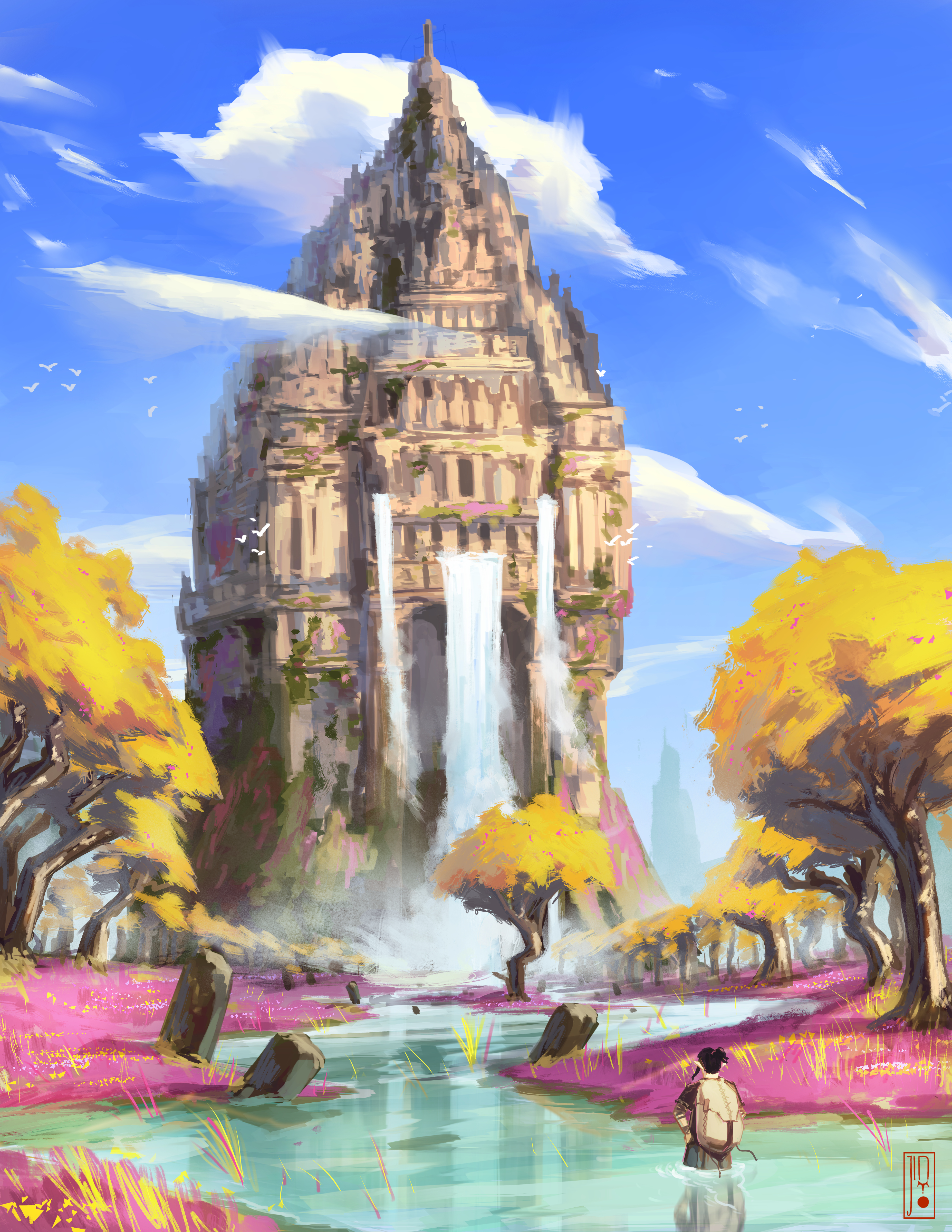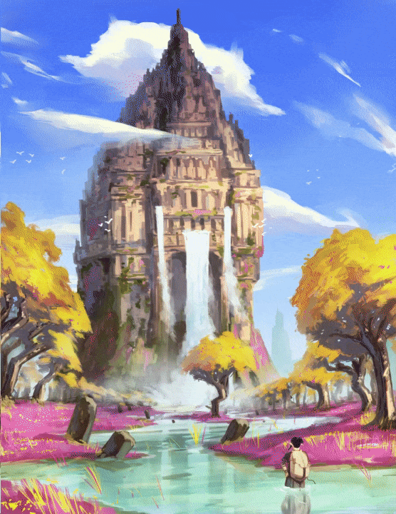 Boy discovers an ancient spirit temple in a land full of Fuchsia and Autumn leaves
